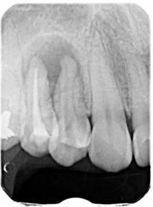 今回、患者さんにとっての一番の問題は、その隣の歯(その右側に見える歯)に、先月から痛みがあり、近隣の歯科医院を受診してレントゲン診査の結果、何らかの原因で歯の中に菌が入り、歯の中で炎症が起こり骨も溶けているとの診断をされたという訴えでした。そこで歯科医師が歯を削ってみると神経が完全に死んでおり麻酔なしでも痛みはなかったということでした。