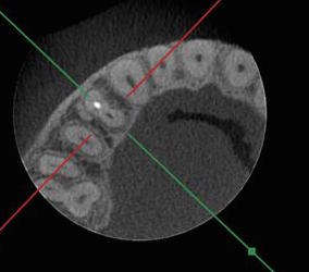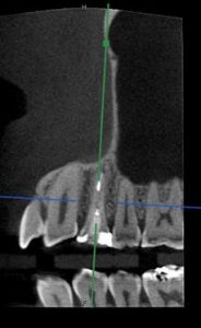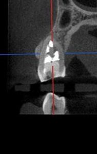 上のレントゲンは歯列に対して床と平行な水平断の像ですが上顎第1小臼歯の舌側根管が取り残していることが確認できました。