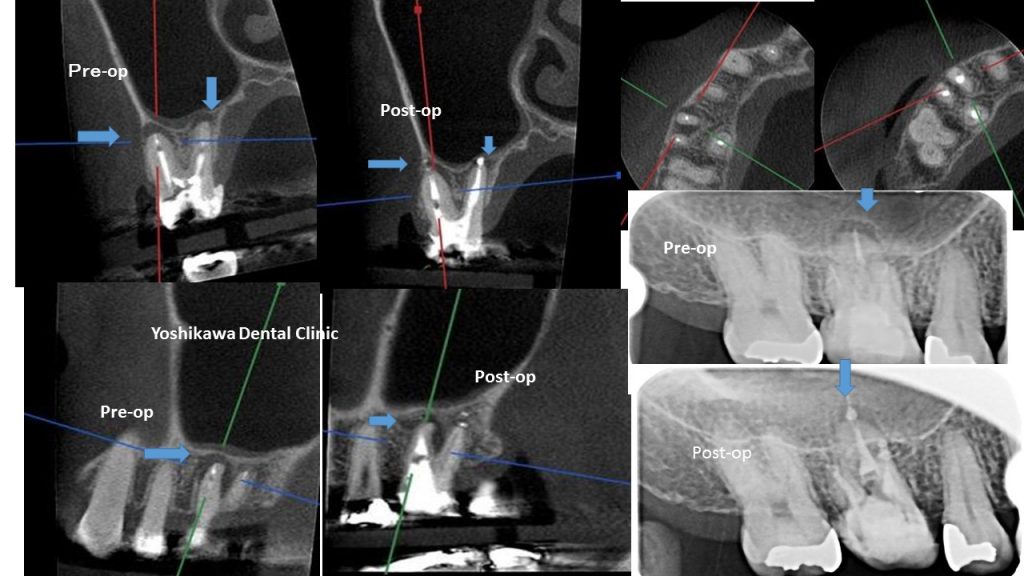 写真は初診時のCT像と根管治療後4カ月のCT像の比較です。