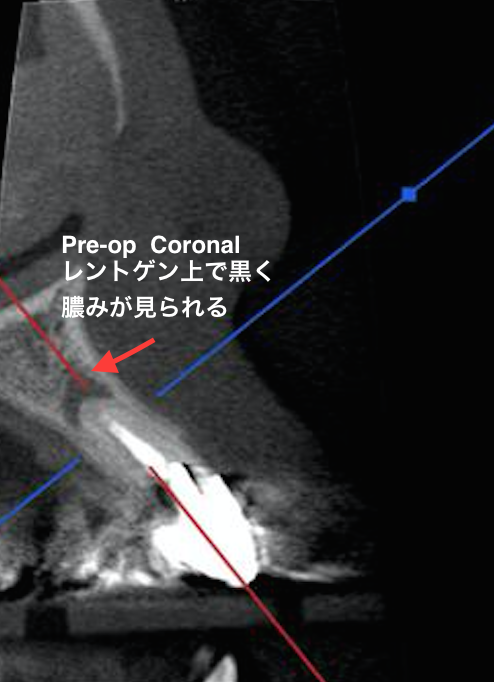 このような場合、CTを撮影すると骨がどのように吸収しているか、そして根管の解剖学的状態を3次元的に観察できます。