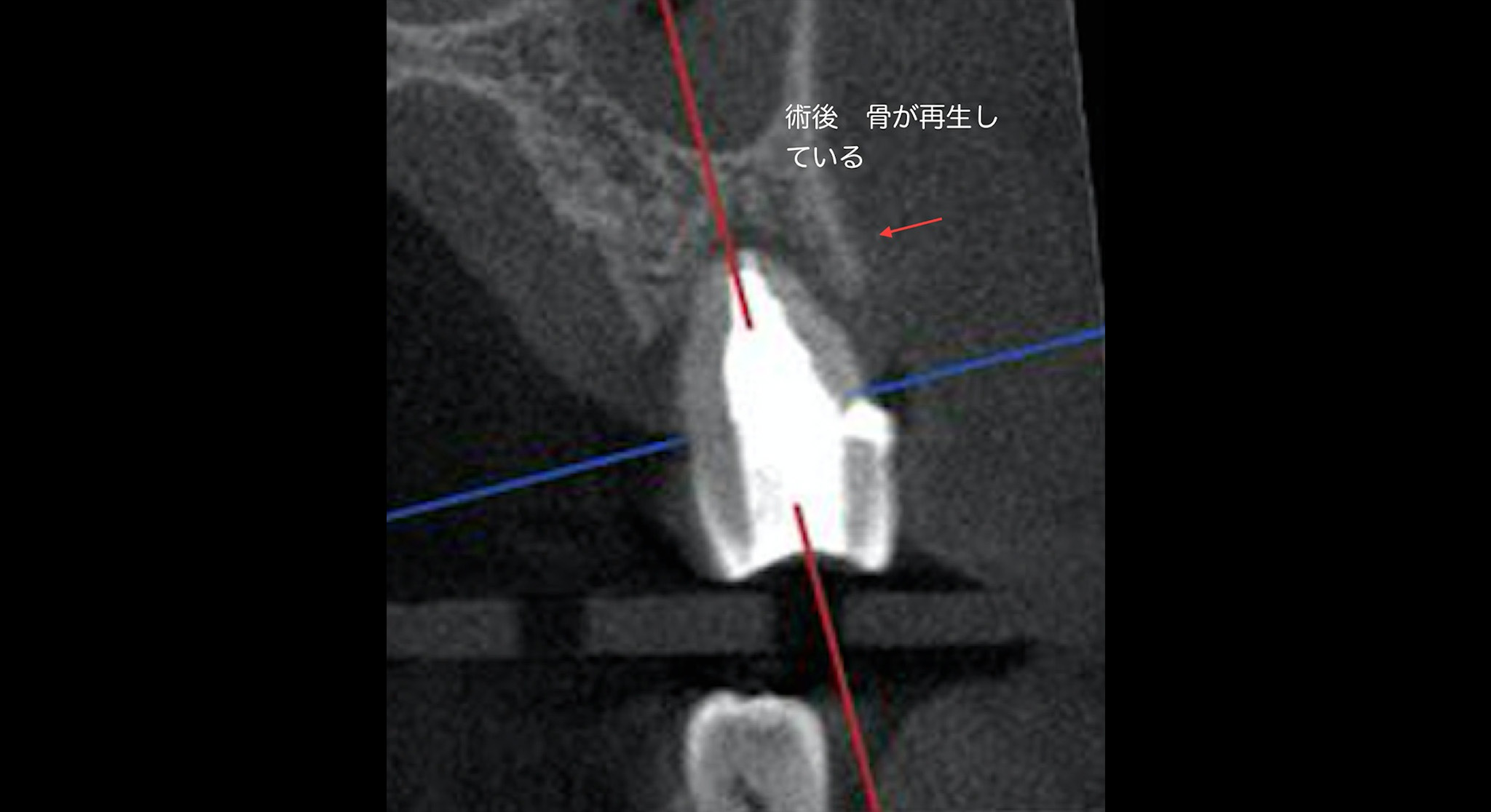 - 歯周病の検査でポケットを測定する時に歯周ポケットがあるからといって必ず歯周病だと診断することは危険です。その理由は歯の内部が細菌感染を起こしてその結果、根の先に膿がたまり膿は組織の弱いところから外に出ようとするために歯と骨の間にある歯根膜という部分から外に向かって排膿しようとして歯周組織が破壊され、あたかも歯周ポケットを形成するように見えるからです。つまり歯周ポケットがあるからといって必ずしも歯周病ではないということになります。もし、診断を間違えて歯周病の治療であるポケットを綺麗にする掻爬術を行ったとすると、歯の表面にあるセメント質を剥ぎ取ってしまうので歯周組織である歯根膜・骨は二度と再生致しません。そのような意味で診断がとても重要になります。こちらの患者様は歯頚部に力により欠損が出来てそこから歯の内部に細菌感染がおこり歯髄がダメージを受け根先端が化膿して排膿を起こして歯周ポケットのような排膿路が出来た症例です。2.5ヶ月にCTを撮影して治癒を確認致しました。骨が見事に再生していることに注目して下さい。根管治療が成功した結果、排膿路が消え歯周ポケットがなくなりました。