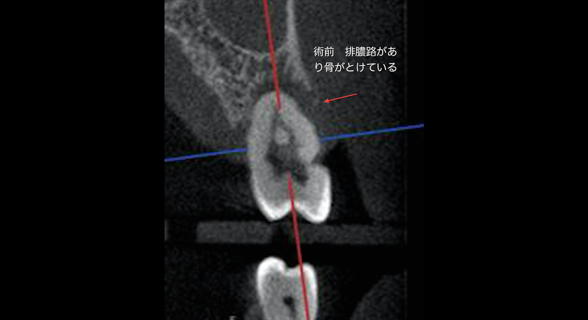 根の先にから約3mmの部分でカットして根の尖端を除去しています。術後3ヶ月なので骨が完全に再生されていませんが治癒傾向を認めます。(今後、骨はより多く再生されると思います)この歯の奥にインプラントを埋入予定なので、この歯の炎症を放置してインプラントは入れられません。