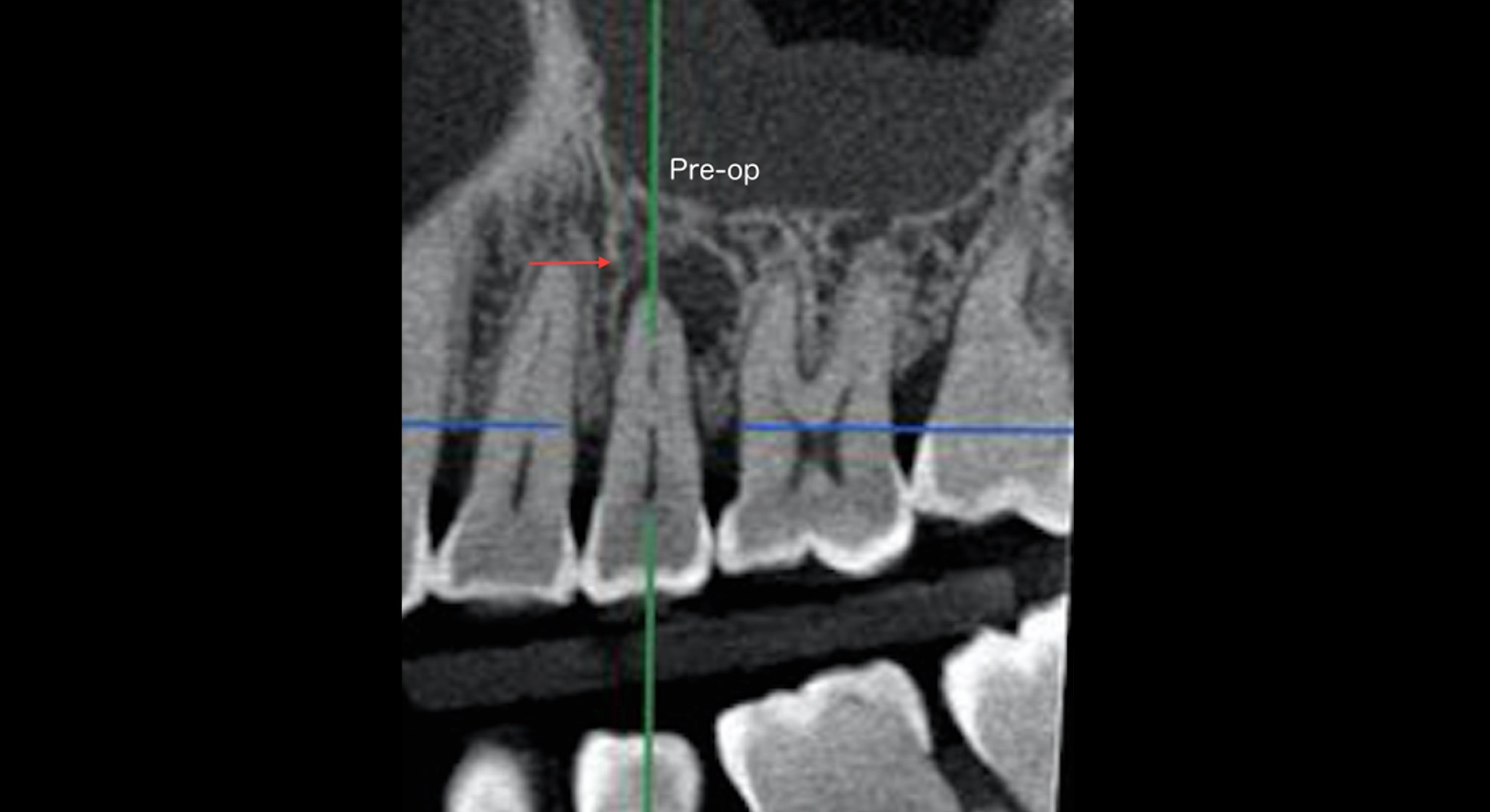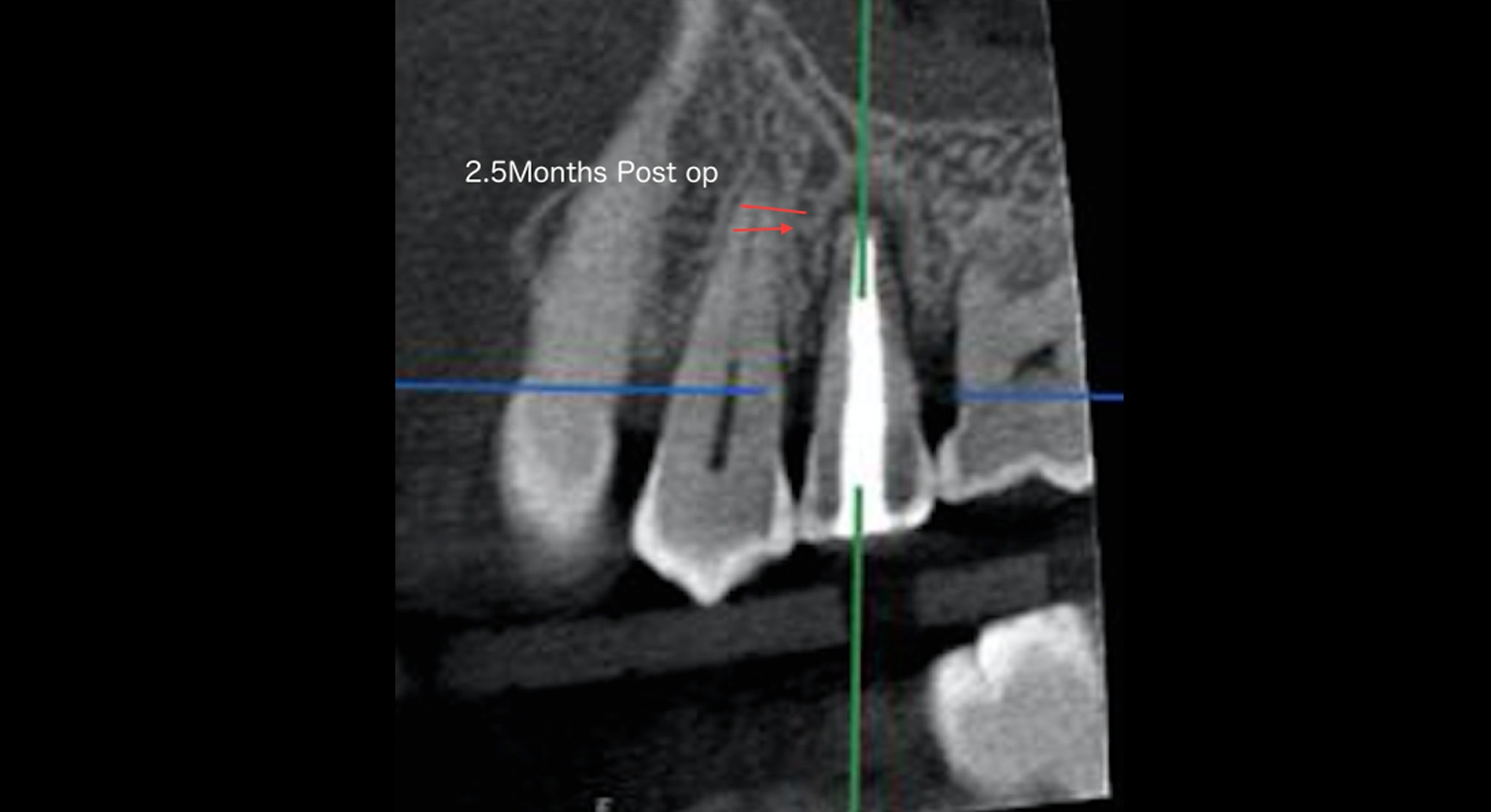 治療内容 歯周病の検査でポケットを測定する時に歯周ポケットがあるからといって必ず歯周病だと診断することは危険です。その理由は歯の内部が細菌感染を起こしてその結果、根の先に膿がたまり膿は組織の弱いところから外に出ようとするために歯と骨の間にある歯根膜という部分から外に向かって排膿しようとして歯周組織が破壊され、あたかも歯周ポケットを形成するように見えるからです。つまり歯周ポケットがあるからといって必ずしも歯周病ではないということになります。もし、診断を間違えて歯周病の治療であるポケットを綺麗にする掻爬術を行ったとすると、歯の表面にあるセメント質を剥ぎ取ってしまうので歯周組織である歯根膜・骨は二度と再生致しません。そのような意味で診断がとても重要になります。こちらの患者様は歯頚部に力により欠損が出来てそこから歯の内部に細菌感染がおこり歯髄がダメージを受け根先端が化膿して排膿を起こして歯周ポケットのような排膿路が出来た症例です。2.5ヶ月にCTを撮影して治癒を確認致しました。骨が見事に再生していることに注目して下さい。根管治療が成功した結果、排膿路が消え歯周ポケットがなくなりました。