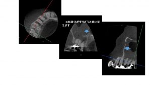 また、根の先に認める膿と上顎洞粘膜が連続している状態がCT像で観察されます。