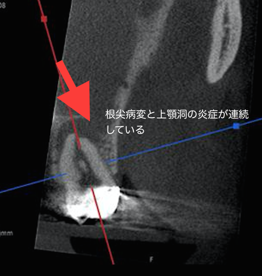 こちらの患者様は2年前に耳鼻科で副鼻腔炎と診断されたそうです。その時点で歯が痛んだこともあり、これは歯が原因ではないかと推測したそうです。賢い方ですね。