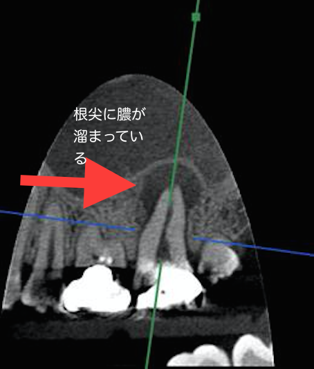 この根の先に膿を認める原因は歯の中の感染にあります。