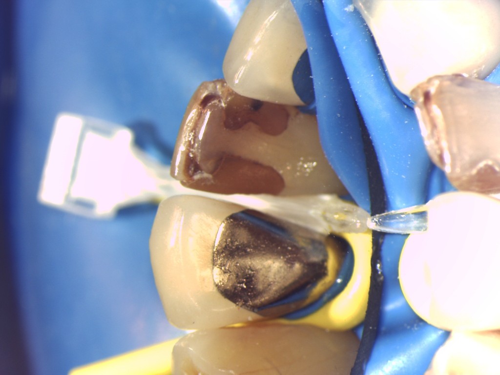 隔壁を固定するためにWejets、バイタインリングを使っています。唾液・湿気を防ぐためラバーダムも必須です。マイクロスコープがなかったら出来ない治療です。