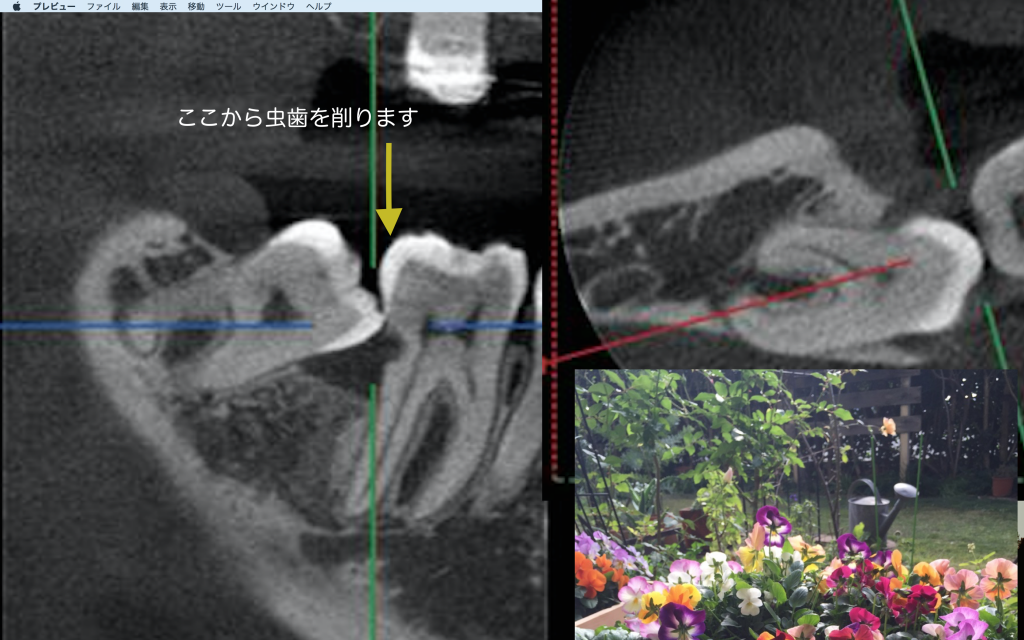 実際ミラーの反射を使い虫歯を除去しようとすると歯肉が被ってきますので歯肉をエルビウムヤグレーザーでカットする必要があります。CTでカットする量を計測しているのでためらいはありません。虫歯の削除量も計測しているので同様にためらいはありません。肉眼の保険治療ではほぼ不可能なマイクロスコープを使用した高度な治療です。