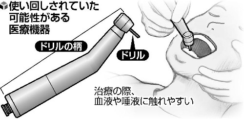 標準的な院内感染対策を示した日本歯科医学会の指針は、使用後は高温で滅菌した機器と交換するよう定めている。