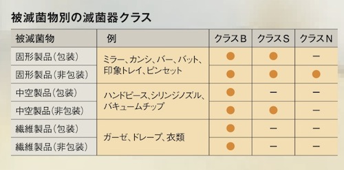 オートクレーブは一般の歯科外来診療所では今や必須の滅菌器ですが、滅菌可能な対象物によってその能力に違いがあることについては、ほとんど知られていません。クラス分けされたヨーロッパの基準については下記の表をご覧下さい。