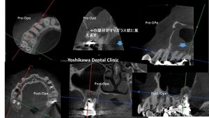 根管治療後に上顎洞炎はすっかり治癒していました。拡大してレントゲン写真をご覧下さい。Post-opeは術後2ヶ月のCT像です。