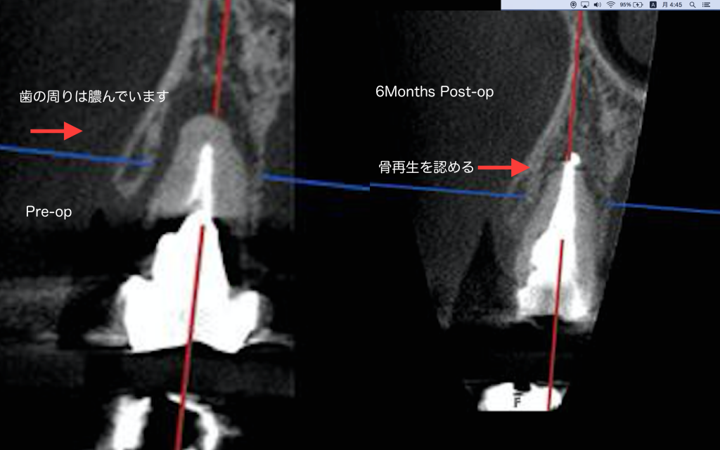 根管外にMTAセメントが出ていますが、これらの性質のために6ヶ月で驚く程、骨再生を認め治癒しています。