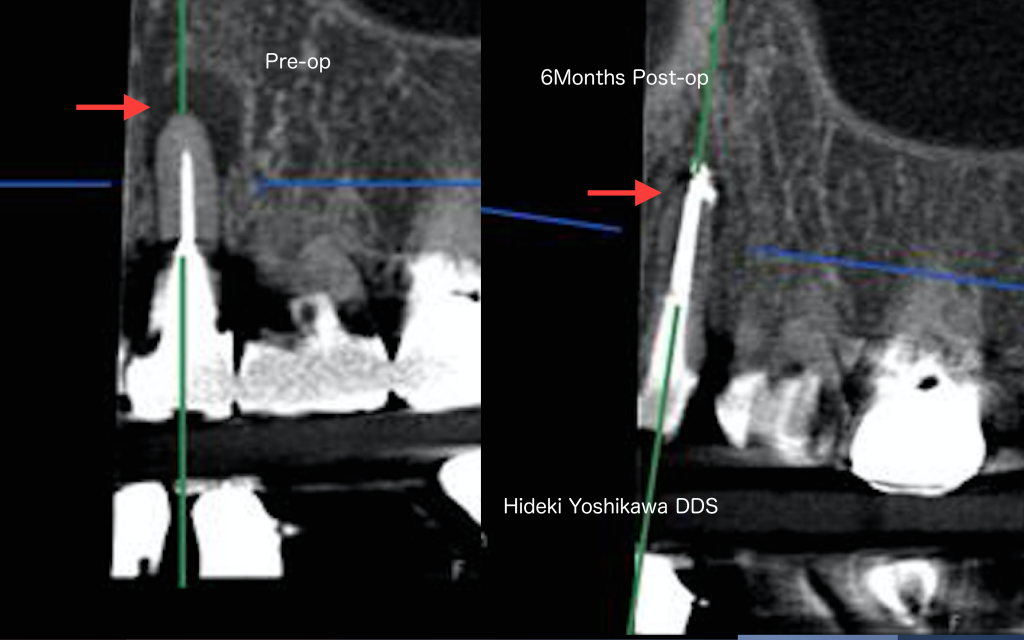 膿が溜まっている歯を根管治療し6ヶ月後のCT像